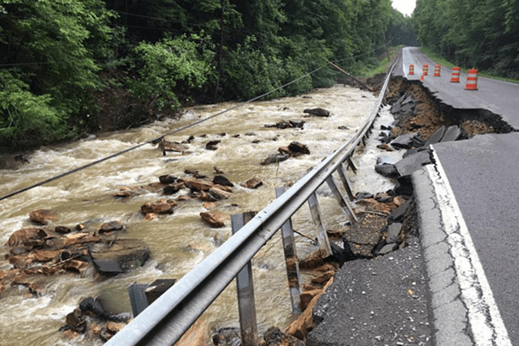 The area surrounding ground zero of the disaster suffered the ills of modern excesses. Mountain Top removal built up the beds of rivers and streams. The scalping of peaks shortens the natural path of rainfall to the streams. The trees and topsoil removed in the process prevents the absorption of the runoff before it hits the waterways. The result is that the rainfall rushes faster and unhindered into the rivers of the valleys. Add to to that the ongoing cutting, paving, and widening involved with roadways and new construction. Each cubic yard of concrete that replaces natural soil and levels the curvature of Appalachian topography damages the region’s ability to handle downpours.